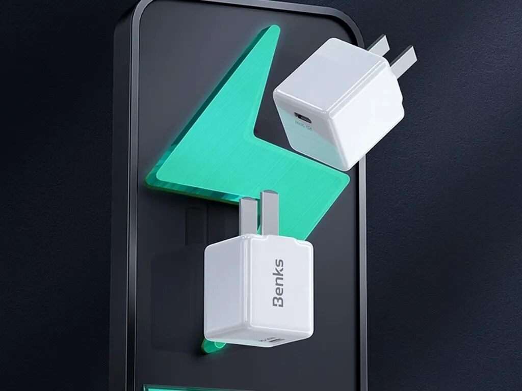 邦克仕20W mini PD充电器型号为“PA43”,采用纯白PC材质壳体制作,方形的外观搭配亮面工艺晶莹剔透,产品侧面印有邦克仕商标“Benks”,主打轻巧便携快充。
