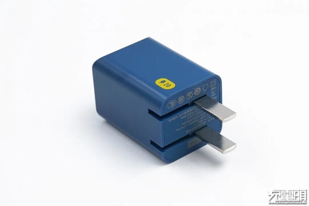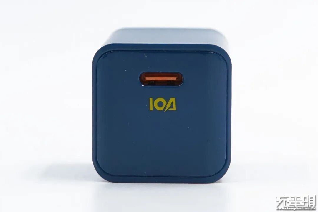 接口配置方面充电器配置一个USB-C输出接口,下方有“PD”字样,表示支持PD快充,值得一提的是接口有一圈金色包边,兼具装饰和保护作用。