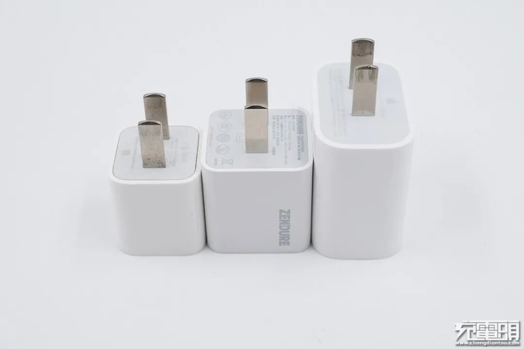 将苹果5W、Zendure征拓20W、苹果 20W一字排开进行对比,可以看到Zendure征拓 20W只比苹果5W大了一圈,远小于苹果 20W。