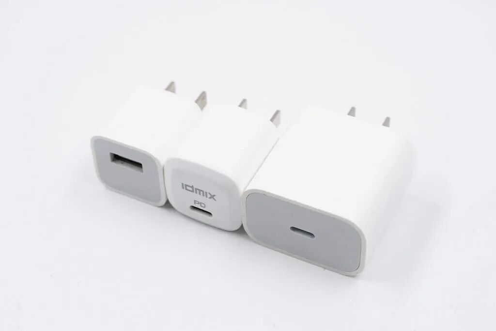 将苹果5W充电器、IDMIX 20W PD充电器和苹果20W充电器排成一列,可以看到IDMIX与苹果5W充电器相差不大。使用游标卡尺实测IDMIX 20W充电器机身不含插脚长度约为30.2mm,宽度为28.58mm,厚度为28.53mm,功率密度0.80W/cm³,充电器净重约为30.4g。