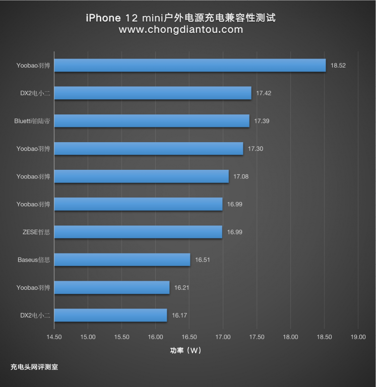 从柱状图上看,最高功率为18.52W,整体的充电功率均在17W左右。但这不是户外电源的USB-C不兼容iPhone 12 mini的快充,只是部分户外电源本身支持的充电功率最高只有到18W,所以才会产生17W左右充电功率的情况。