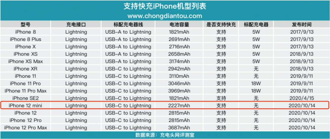 这是充电头网整理的目前支持USB PD快充的iPhone手机列表,可以看到在这份列表里面就有iPhone 12 mini的存在。虽然iPhone 12 mini是今年最小的5G手机,但在充电方面苹果也为其标配了USB PD快速充电的功能,用户依旧可以通过PD快充半小时为iPhone 12 mini充入50%的电量。