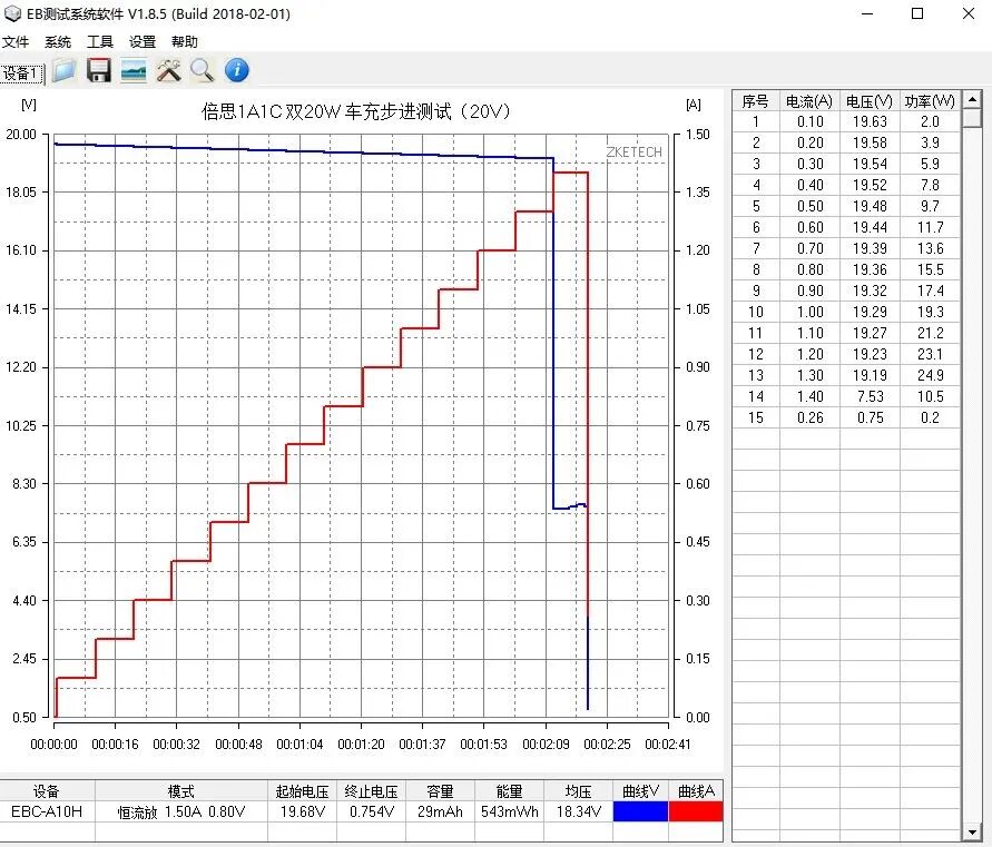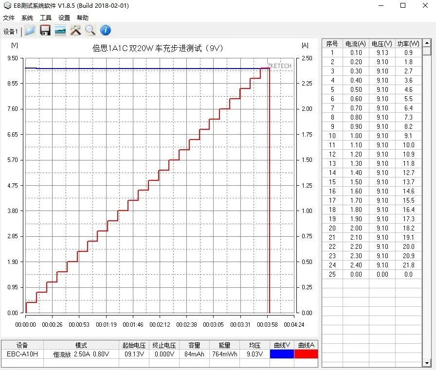 使用EB程控电子负载测试Baseus倍思 1A1C 双20W车充的最大输出功率,以0.1A为电流步进幅度,10秒为时间间隔,最终录得车充在9V档位的最大输出为9.10V 2.40A 21.8W。