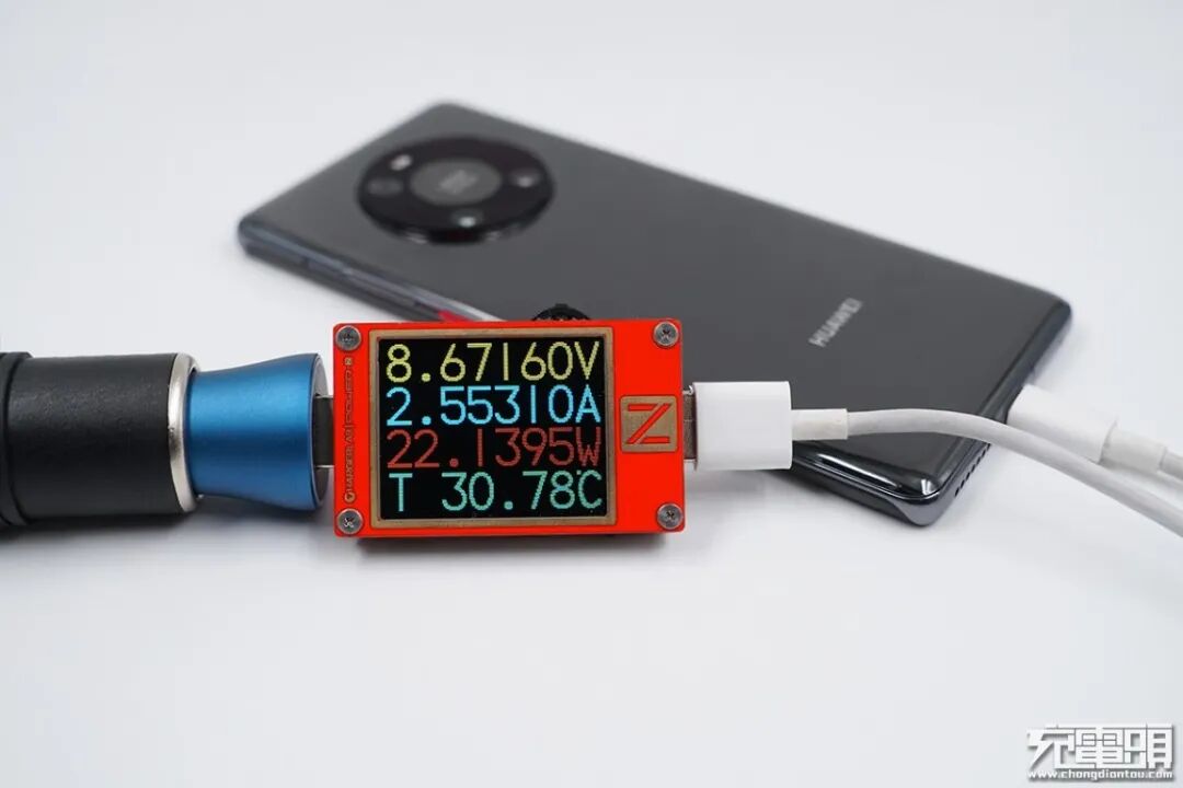 华为Mate40 Pro 支持SCP、FCP和 USB PD快速充电协议,使用Baseus倍思 1A1C 双20W车充的USB-A为其充电,功率为8.67V 2.55A 22.13W。