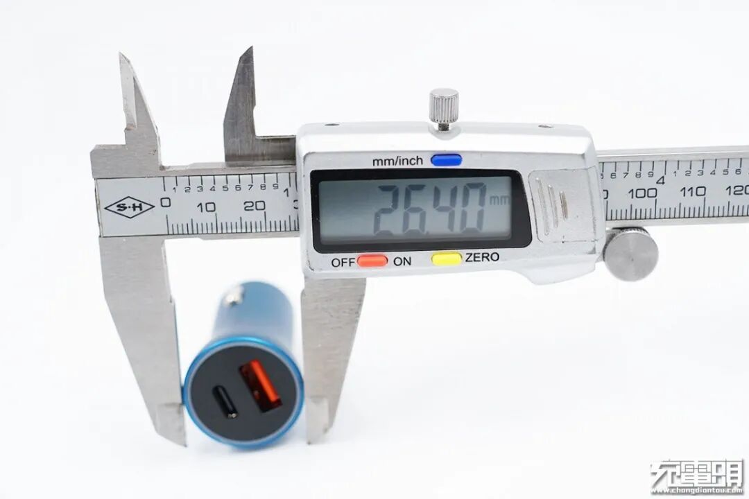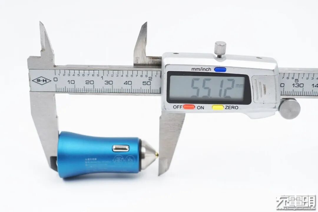 使用游标卡尺测量这款车充的长度为55.12mm,