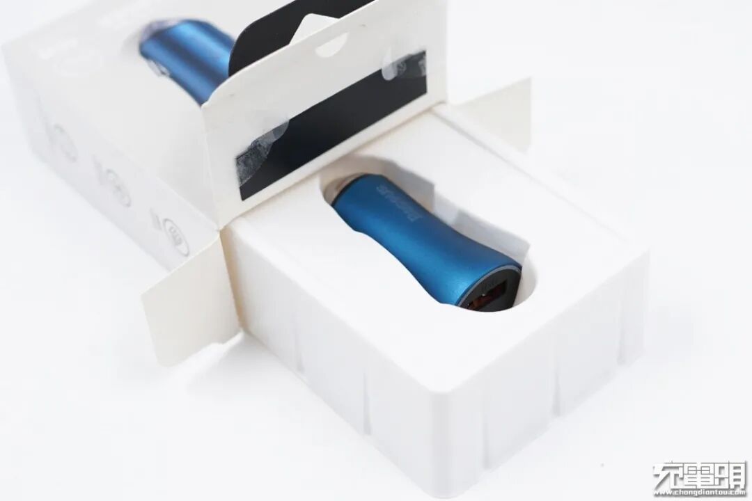 激动的心,颤抖的手,打开包装可以看到车充安稳的“躺”在塑料托盘上,被保护的很好。