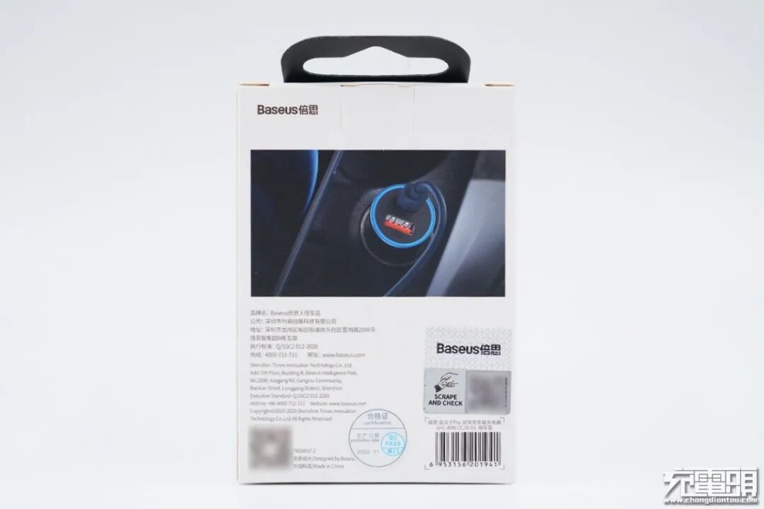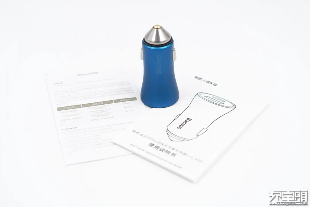 倍思家产品的包装向来是一脉相承,尤其是同一个产品线,风格大都相似。这款车充的包装也是如此,除了左上角的“Baseus”logo,还有顶部的挂钩,都让我有非常熟悉的感觉。正面的产品渲染图为蓝色子弹头式样,有些微磨砂的质感。