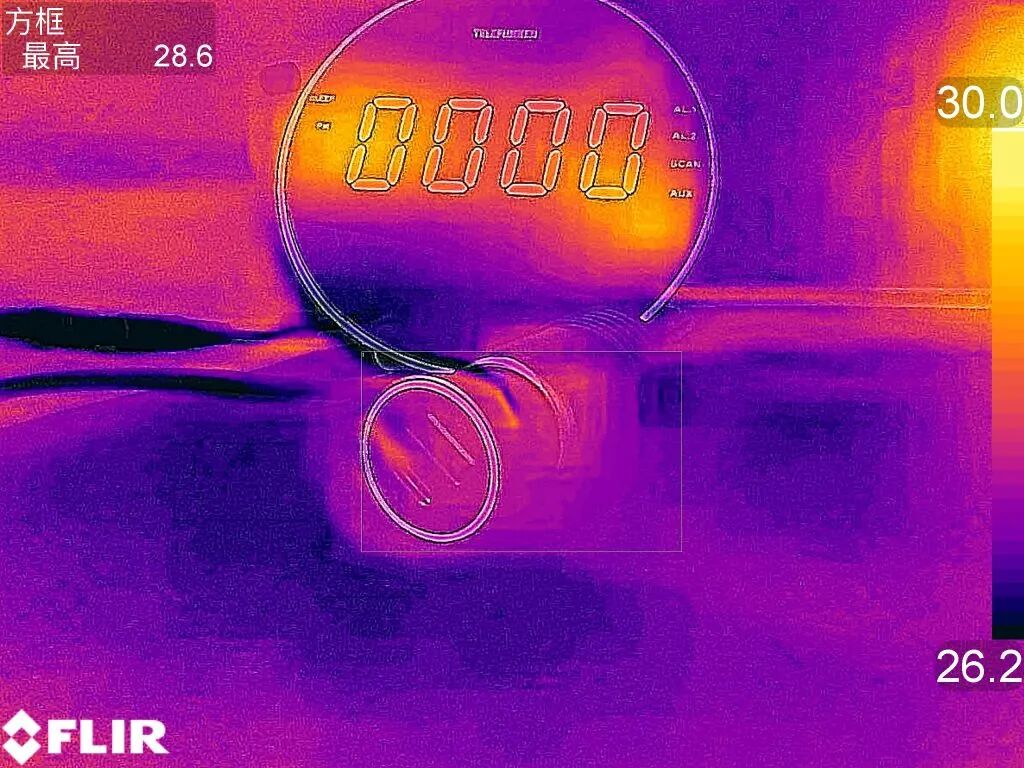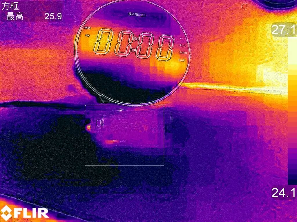 对车充的温升进行测试,测试条件为在温度约为25℃的恒温箱内以9V 2.22A 20W的功率持续输出一小时进行测试。准备开始测试前,车充最高温度为25.9℃。
