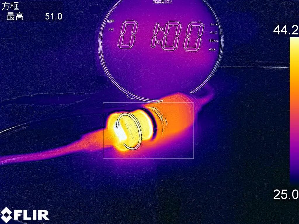 一小时后,未从“点烟器”拔出车充时,仅测量外部温度,当前最高温度为51℃,温升约为22.4℃。