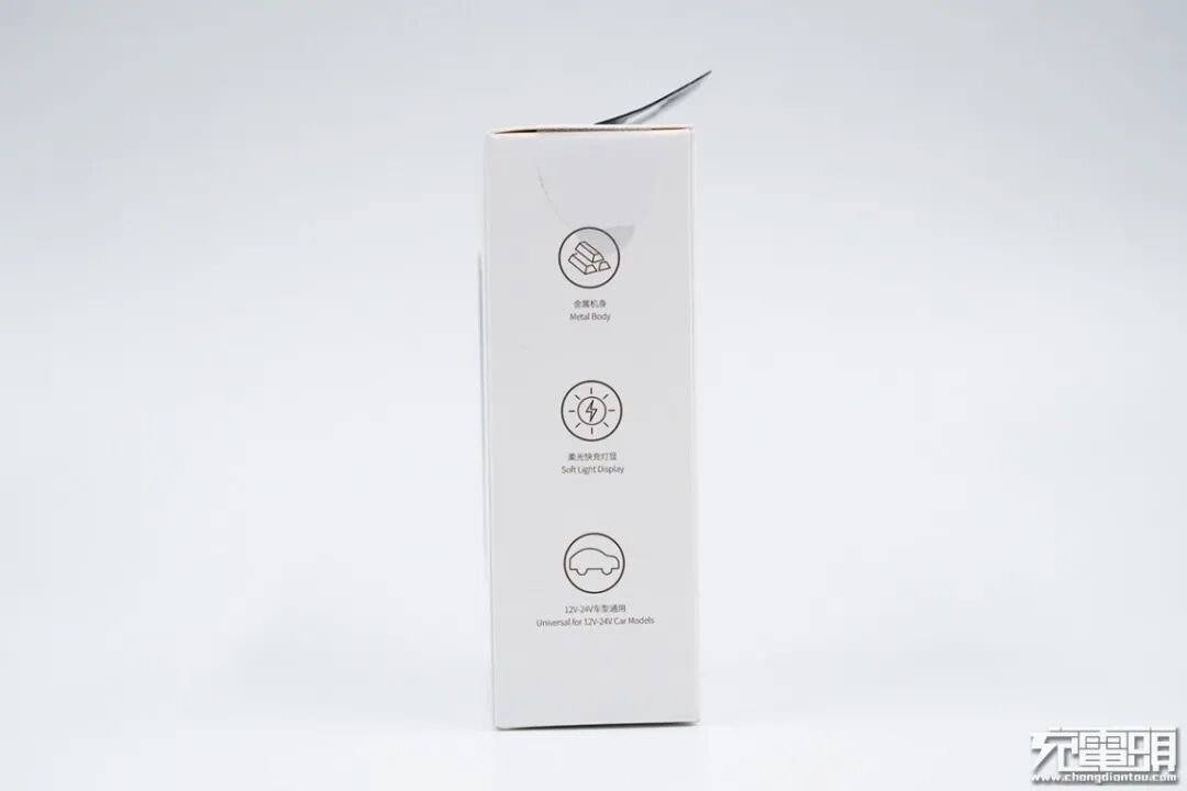 侧面印有三大卖点:金属机身、柔光快充灯显、12V-24V车型通用。