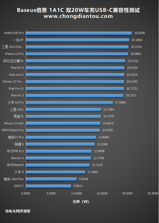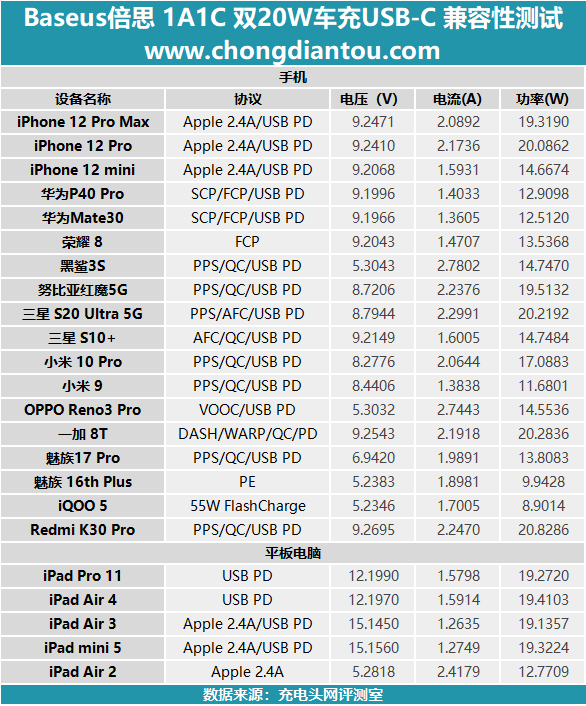 为了让大家更方便查阅,我们将车充USB-C接口充电兼容性的测试数据放在表格当中。可以看到大部分设备都符合预期,iPhone 12系列除了mini功率都接近20W;iPad的表现也不错,除了老款的iPad Air 2,功率也都接近20W 。安卓机型中Redmi K30 Pro、一加 8T与三星S20 Ultra表现最好,均超过20W。