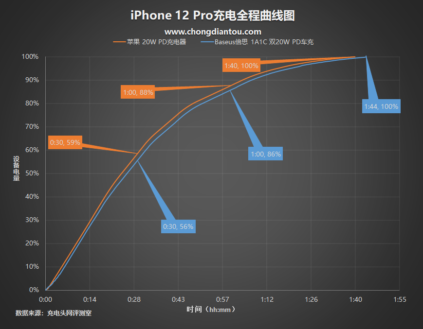 将Baseus倍思 1A1C 双20W车充对iPhone 12 Pro的全程充电测试数据制作成曲线图,车充半小时为iPhone 12 Pro充入56%电量;1小时充入86%电量;全程耗时约1小时44分。与苹果20W充电器为iPhone 12 Pro充电的曲线图对比,可以看到基本一致。