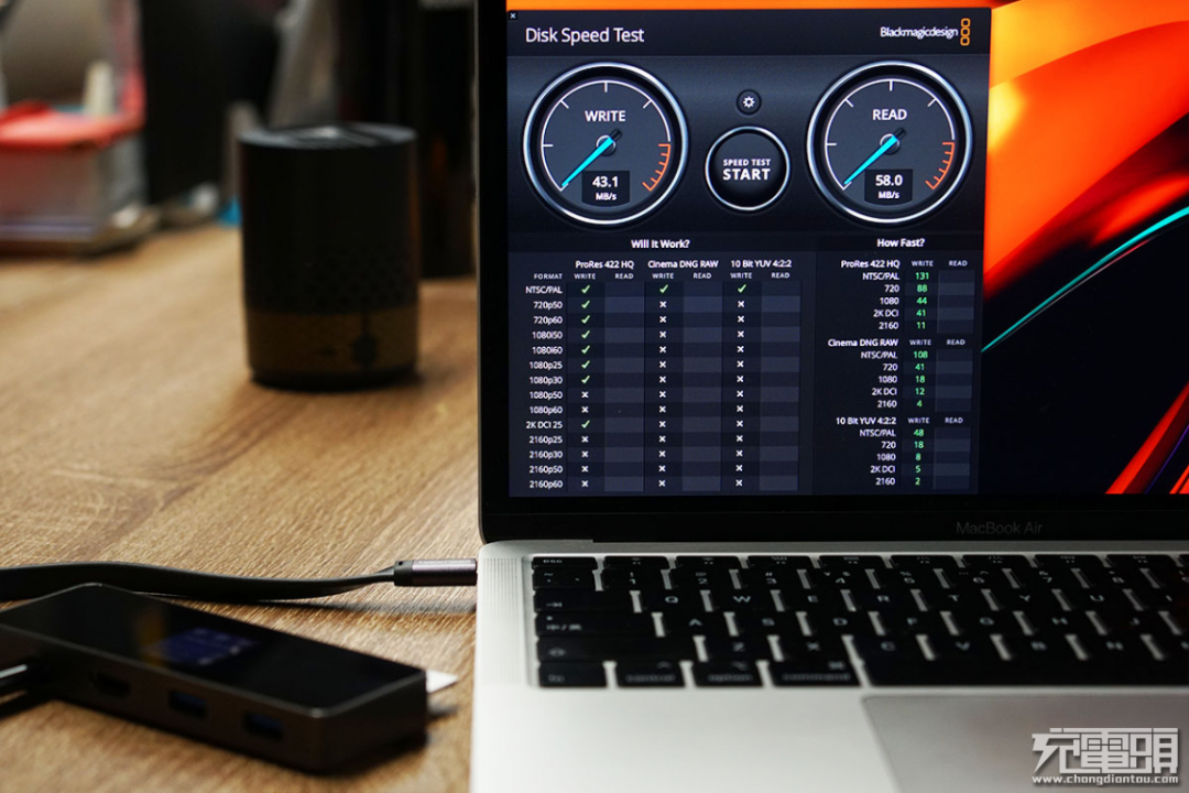 将内置硬盘的硬盘盒通过USB-A to USB-C的线材连接至拓展坞的USB-A接口,底部中间的位置亮起,并且可以看到5Gbps的标识。