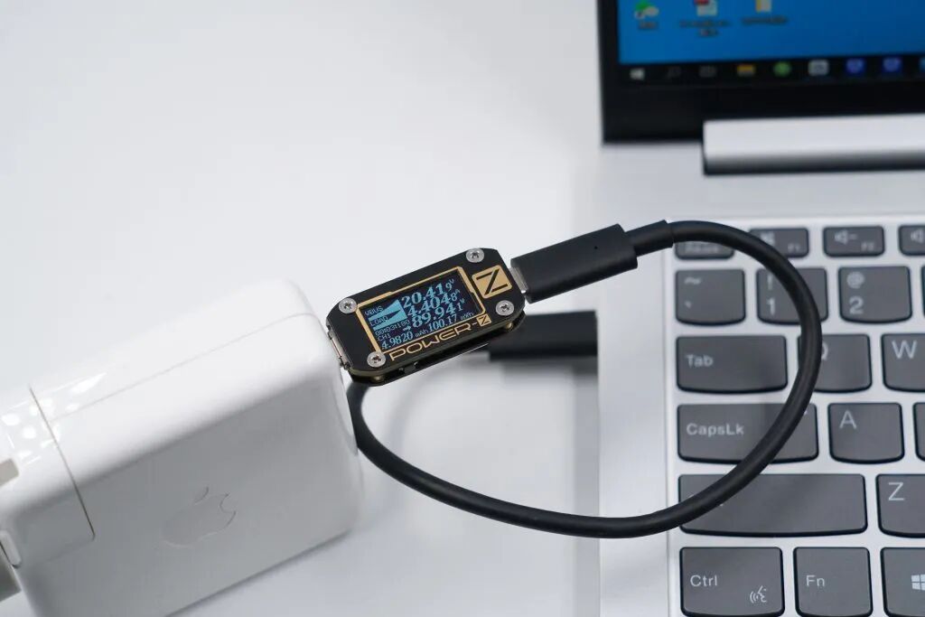 先举个代表,苹果96W充电器为纯USB PD快速充电器,共有四个固定电压输出档,分别是5V3A、9V3A、15V3A、20V4.7A。使用苹果96W充电器为联想小新Pro 14笔记本充电,功率为20.41V 4.4A 89.94W,将至巅峰。