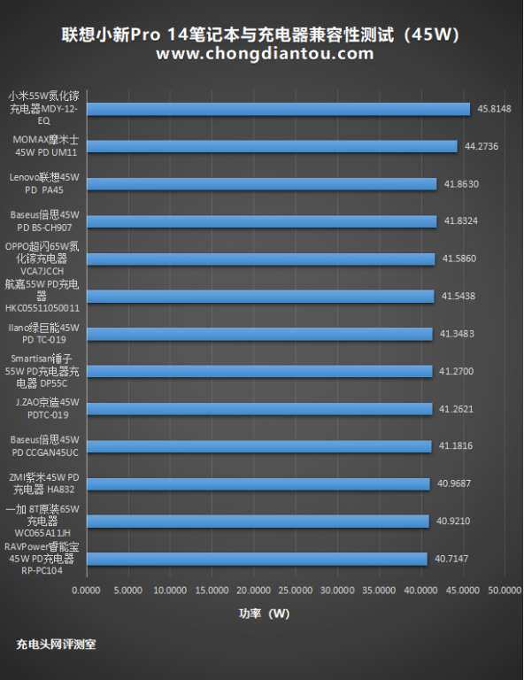 为了更直观的展示,将数据整理到柱状图中,可以看到13款充电器中,功率最大达到45.81W,最小的约为40.71W,两者相差约5.1W。