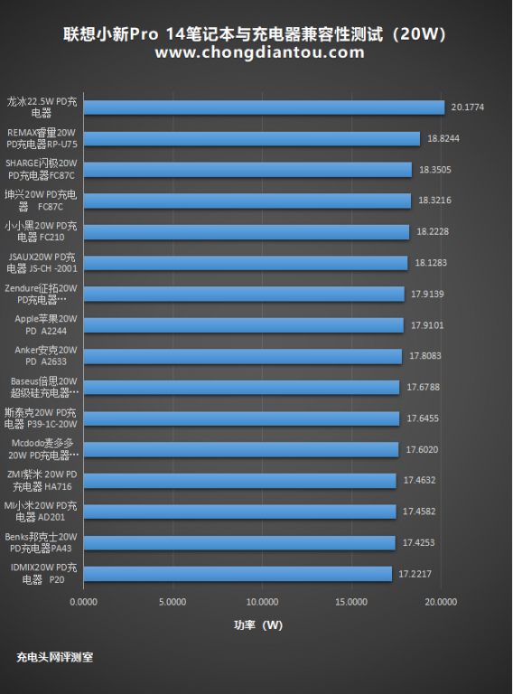 为了更直观的展示,将数据整理到柱状图中,可以看到16款充电器中,功率最大可以达到20.17W,最小约为17.22W,两者相差约2.95W,对一款笔记本的充电来说,效果差异基本可以忽略。