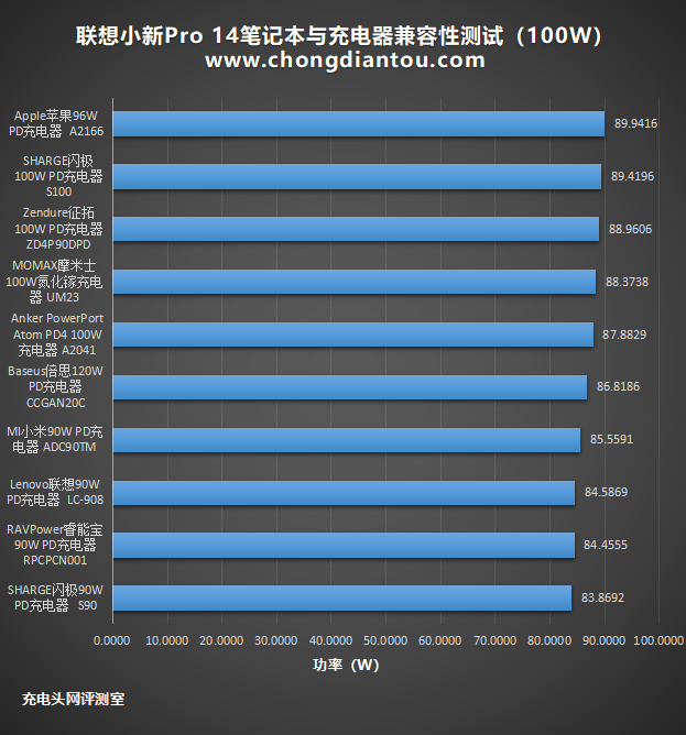为了更直观的展示,将数据整理到柱状图中,可以看到10款充电器中,功率最大达到89.94W,最小的约为83.86W,两者相差约6.08W。