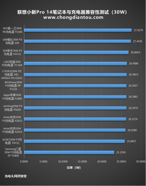 为了更直观的展示,将数据整理到柱状图中,可以看到12款充电器中,功率最大达到27.62W,最小约为,两者相差约4.47W。相对于20W级别的2.95W差距,30W级别的差距在逐渐拉大。