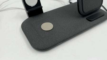 这是mophie二合一无线充电板布面款完整的使用形态,右边是手机的使用区域,左边则一上一下分别是手表和耳机。
