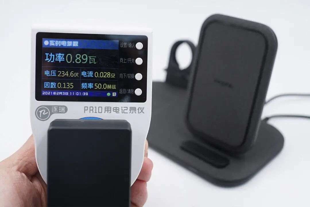 在不放任何设备时,充电器端功率显示为0.89W。
