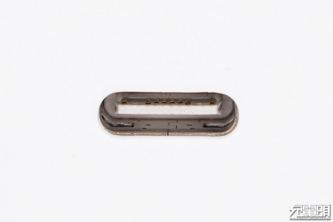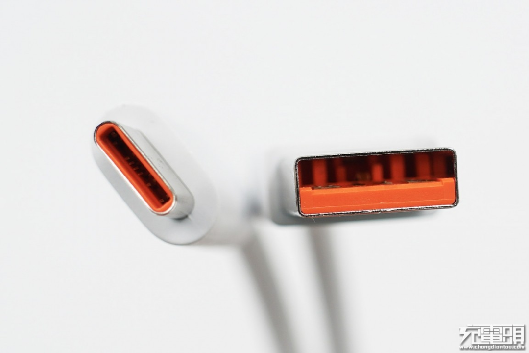 USB-A公头的正负极加宽来通过大电流,中心处设有特殊弹片,颜色为橘红色,有些别致。线缆长度约为 1m,直径为 3.73mm。