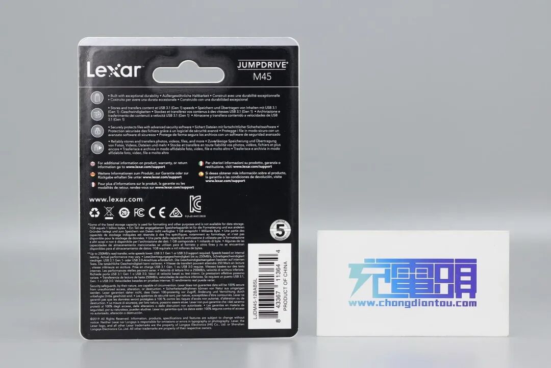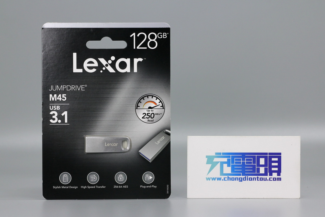 包装卡片正面是“Lexar”的品牌Logo,左侧标注出了U盘的型号为M45,USB标准为USB3.1,右侧可以看出最高读取速度可达250MB/s。