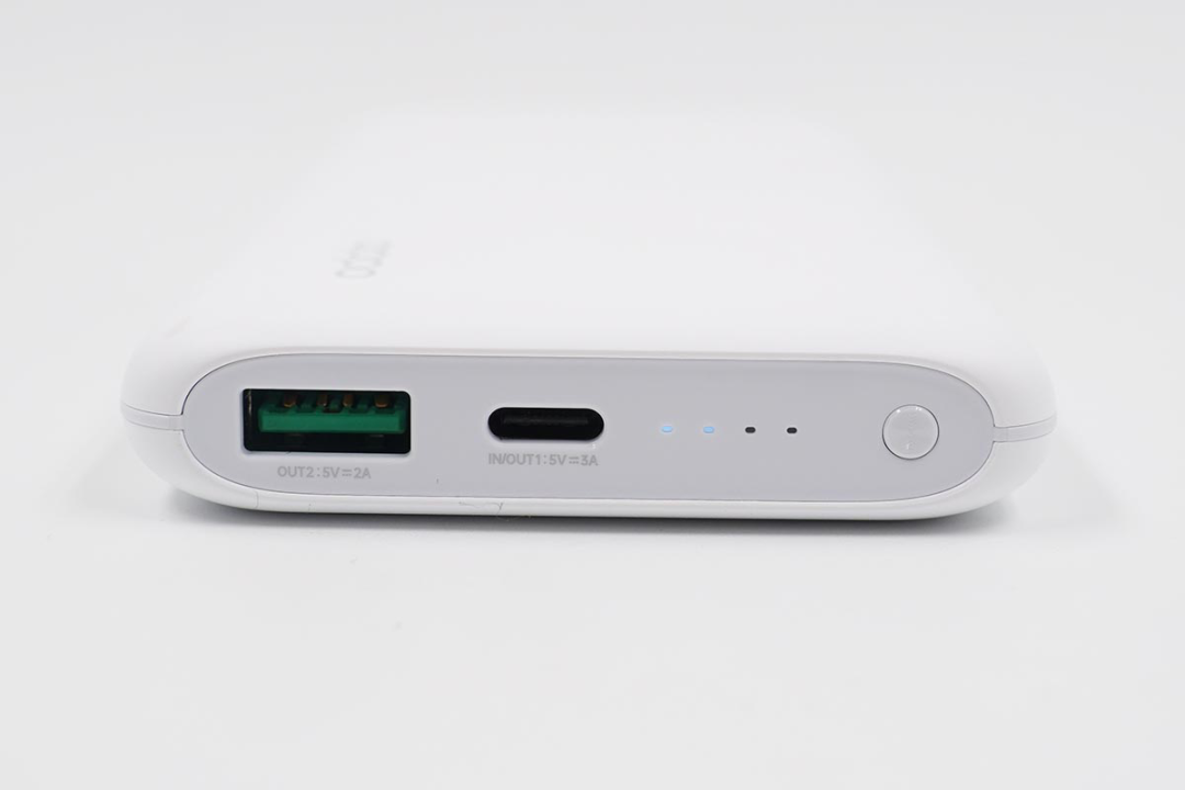 接口配置部分,充电宝配备了一个USB-A输出接口、一个USB-C双向快充接口。右侧是电源指示灯以及电源按键,电源按键略微突出的设计方便用户盲按操作。
