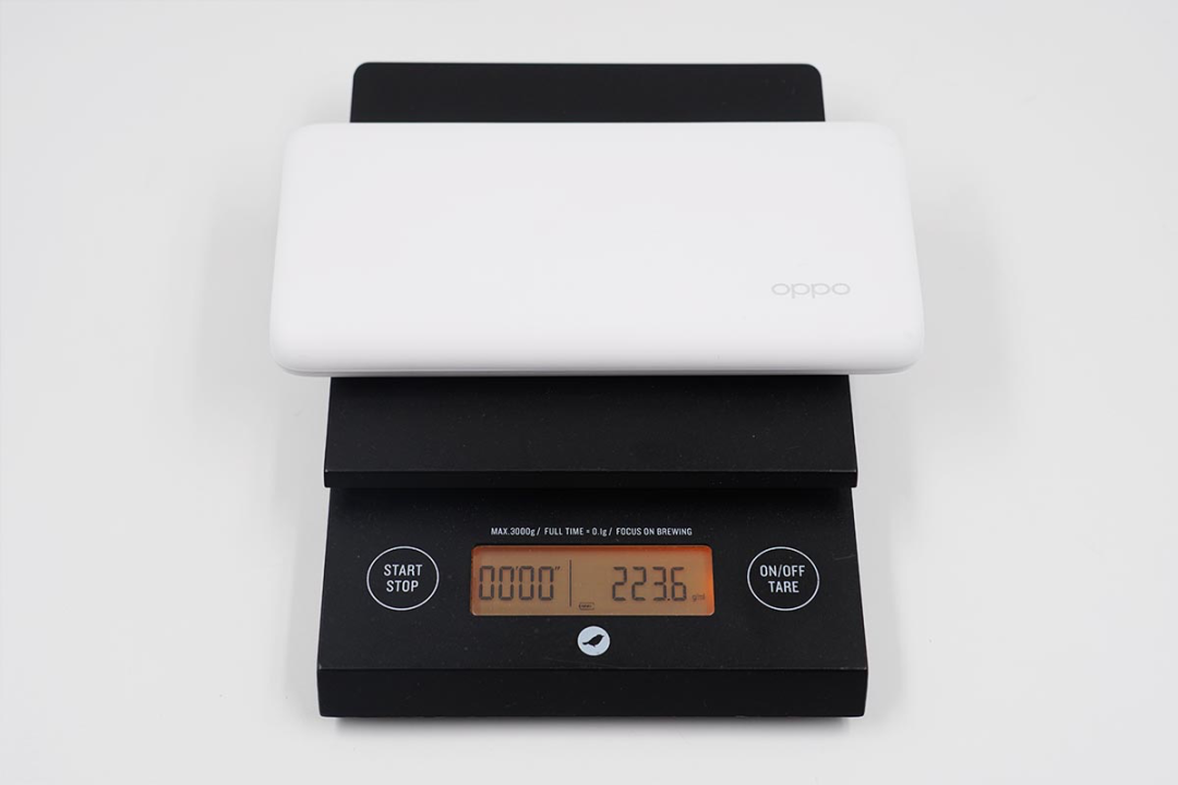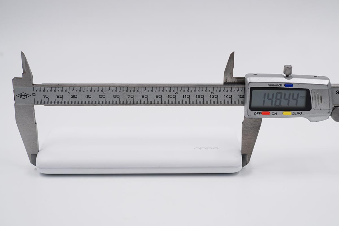 充电宝通体白色外壳,整体设计较为扁平,边缘处过渡圆润可以保证握持的手感,在角落的位置印有“OPPO”的品牌Logo。