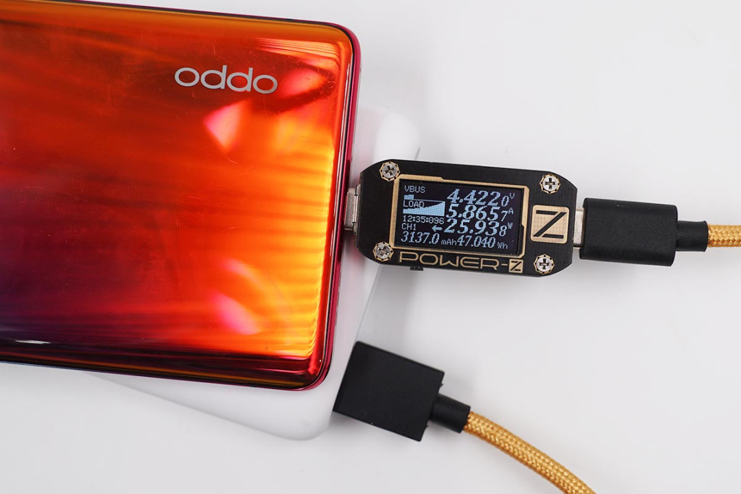 OPPO Reno 3 Pro仅支持VOOC闪充,使用充电宝的USB-A搭配VOOC闪充线为OPPO Reno 3 Pro充电,功率为4.42V 5.86A 25.9W,此时处于VOOC闪充状态。