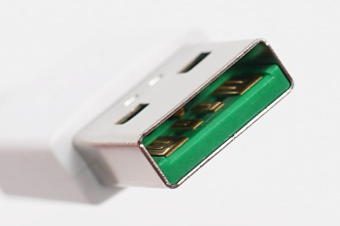 USB-A端的内部依旧为标志性绿色胶芯,内部四个触点中两侧加宽设计,在内部额外带有一个触点可以搭配充电宝的USB-A端实现VOOC闪充输出。