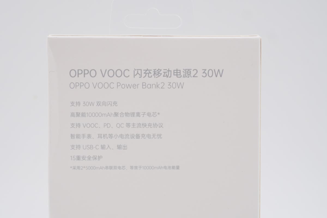 包装盒的背面上半部分印有产品的一些特点,支持30W双向闪充;高聚能10000mAh聚合物锂离子电芯;支持VOOC、PD、QC等主流快充协议;智能手表、耳机等小电流设备充电无忧、支持USB-C输入、输出;15重安全保护;采用2*5000mAh串联双电芯,等效于10000mAh电池容量。
