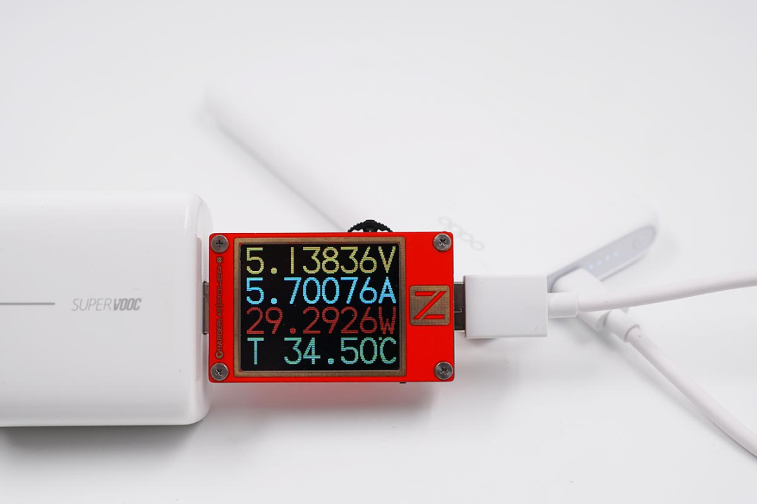 实测使用OPPO VOOC系充电器搭配VOOC快充线为充电宝充电,功率为5.13V 5.70A 29.29W,充电宝支持VOOC闪充输入。