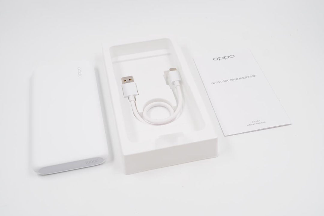 包装盒内除了充电宝本身之外还附带了一根线材,搭配充电宝可以为OPPO手机提供大功率的快速充电。
