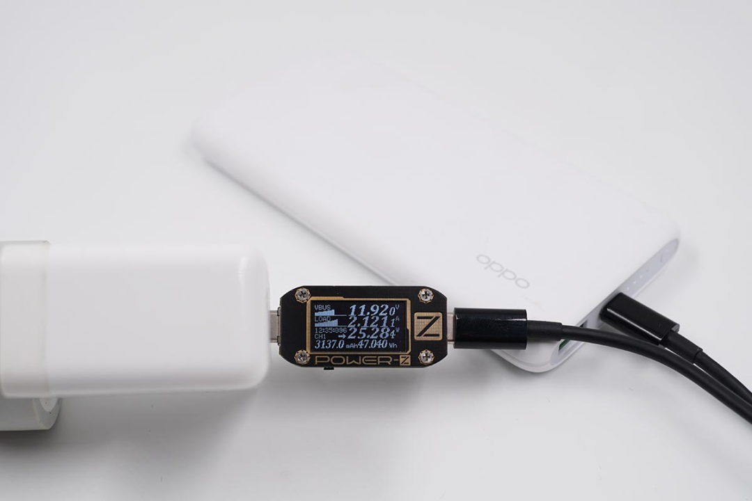 随后笔者使用PD充电器搭配双USB-C线材为充电宝充电,功率为11.92V 2.12A 25.28W,充电宝同样支持PD自充输入,并且依旧可以有不错的自充功率。