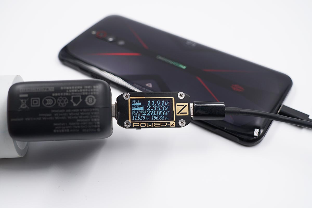 使用充电器的USB-C为努比亚红魔5G手机充电,功率为11.91V 2.35A 28.03W。