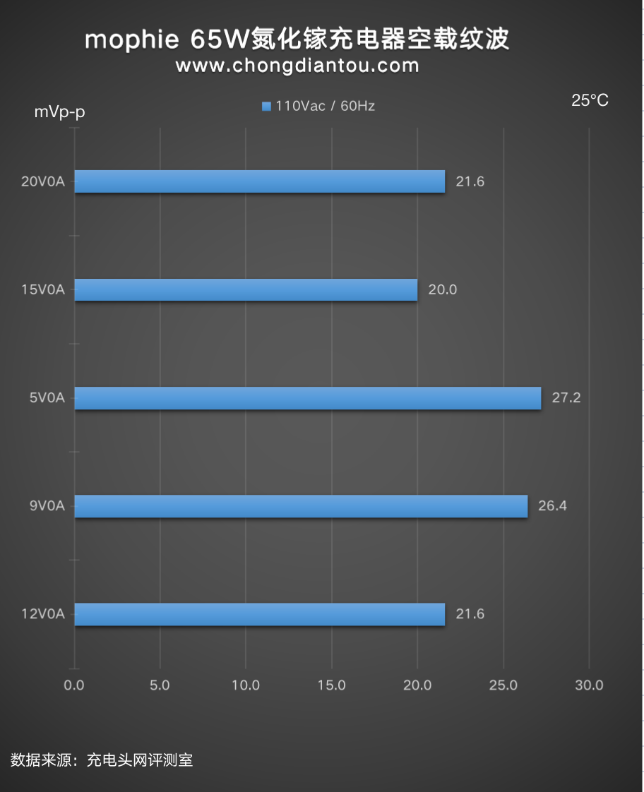 国家标准中充电器纹波要求是不高于200mVp-p,mophie 65W氮化镓充电器在110V 60Hz、240V 50Hz输入电压下,所有输出功率纹波峰峰值均低于200mVp-p这个标准很多,表现不错。