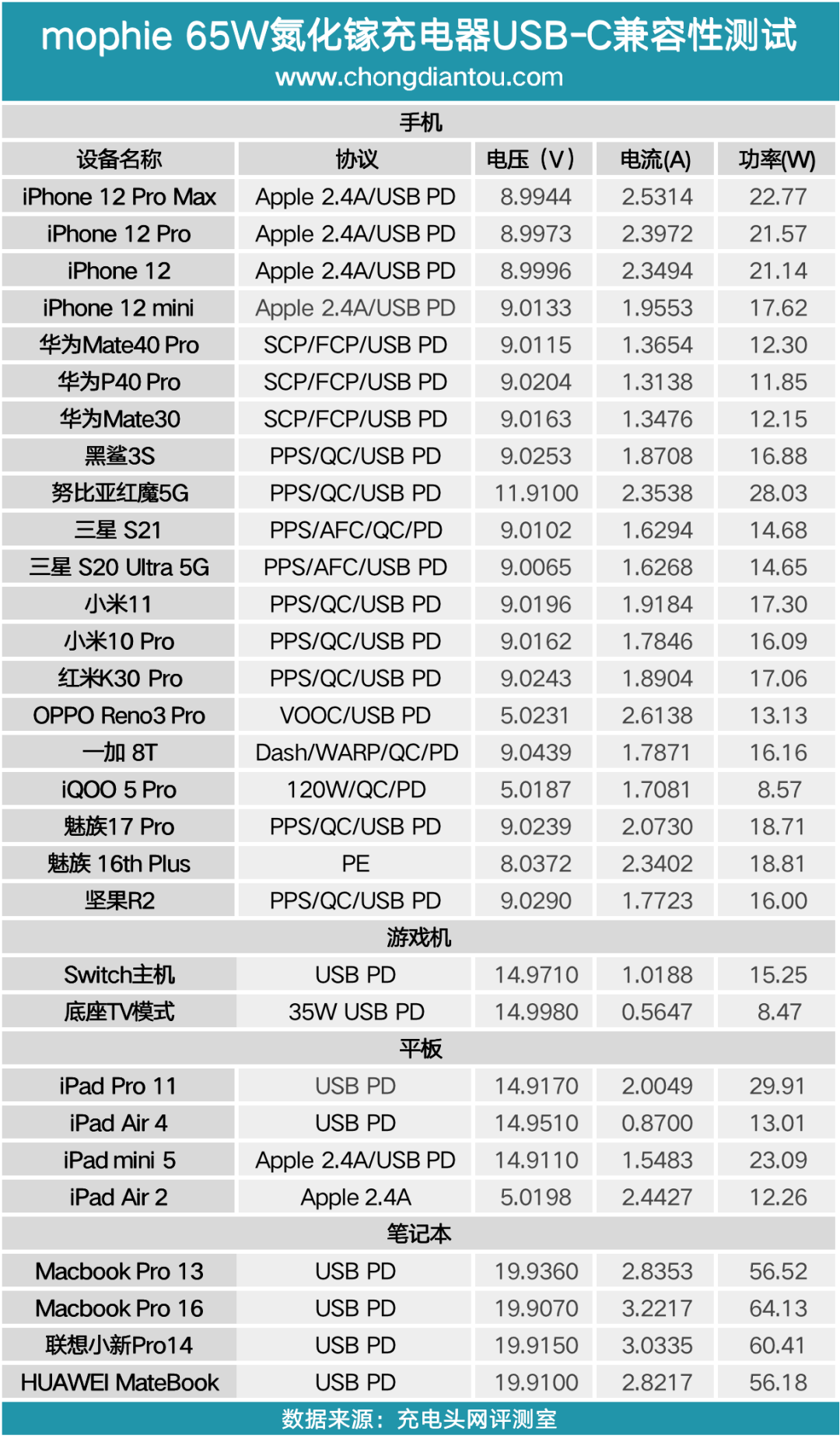 将USB-C的测试数据汇总成表,整体来看对于设备的快充支持情况都很不错,没有出现不兼容的情况。65W大功率的加持在为笔电充电时也可以提供不错的快充功率。