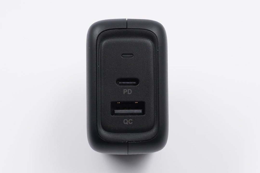 充电器配备了1C1A双USB充电接口,下面的PD、QC标识也说明了充电器支持快充。