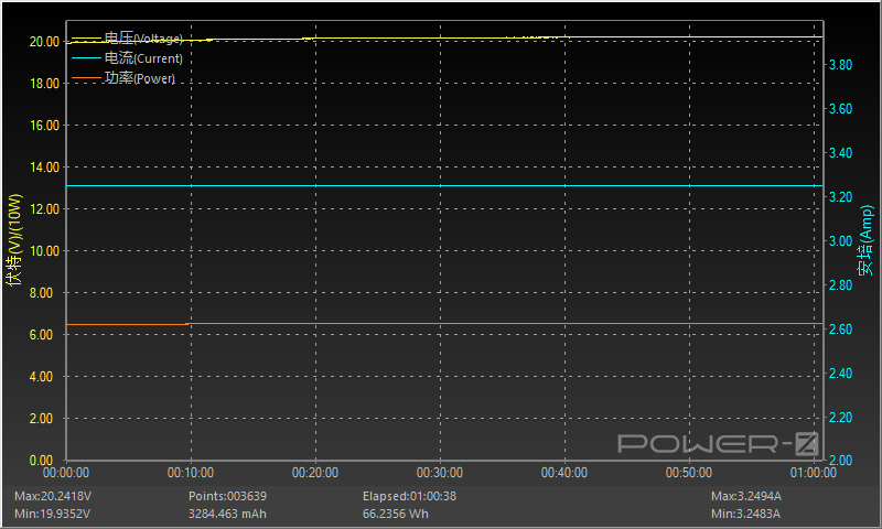 按照额定功率20V 3.25A 65W满载对充电器进行稳定性测试,测试时间为一小时,测试过程中电压值呈水平直线,无明显波动情况,长时间满载比较稳定。