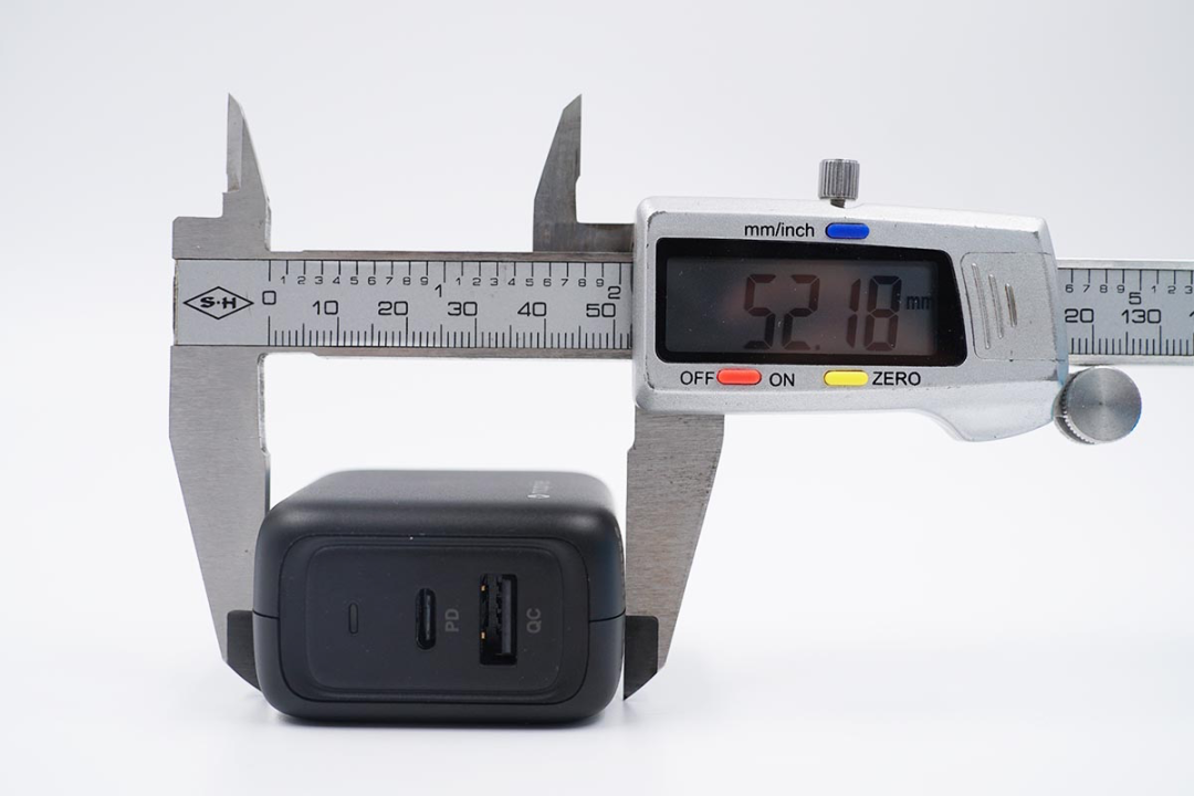 可以得出充电器的三维参数为53.32x52.18x31.20mm,体积约为86.80cm³,进而得出充电器的功率密度约为0.74W/cm³ 。