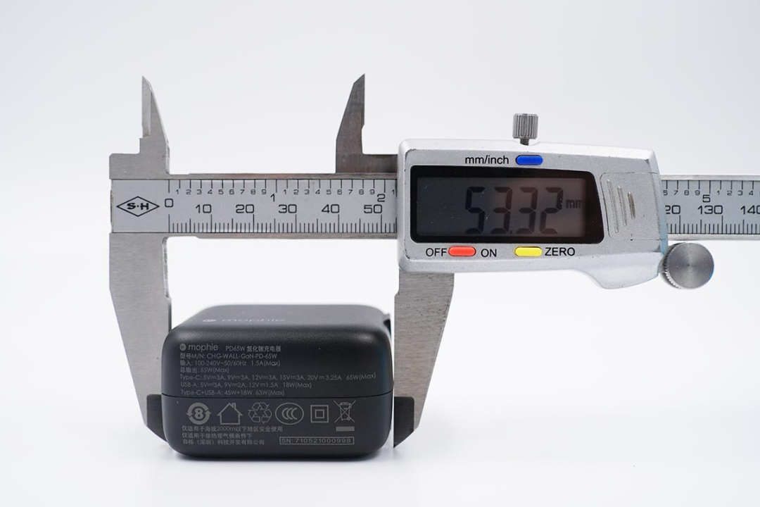 使用卡尺实测充电器的长度约为53.32mm。