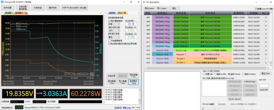 这也是POWER-Z KM001C测试仪的一大特点,可以监测到当设备连接到充电器之后开始充电到握手适合的快充输出档位之间的一系列变化过程。