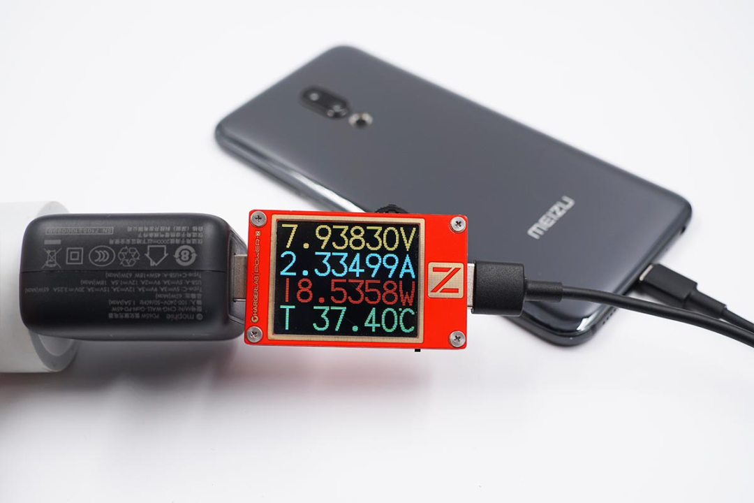 使用USB-A为魅族16th Plus手机充电,功率为7.93V 2.33A 18.53W,成功触发PE快充。