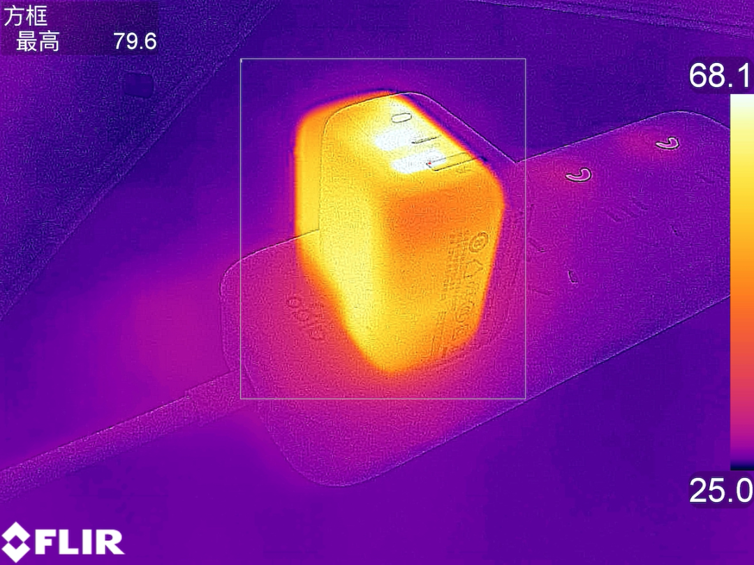 1小时后采集到充电器的温度为79.6℃,温升53.9℃。