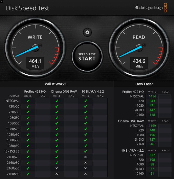 此外笔者还将雷电3数据线更换成USB4数据线进一步进行测试,最终实测写入速度为464.1MB/s,读取速度为434.6MB/s。