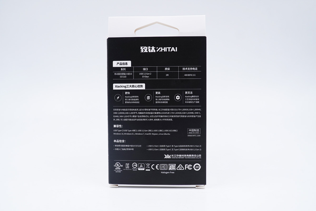 背面是固态硬盘的一些文字描述信息,系列:移动固态硬盘 木星10(ST210)、接口:USB3.2 Gen2 10Gbps、质保:3年。致钛木星10号采用了长江存储创新性的Xtacking架构,拥有更快的I/O传输速度、更高的存储密度、并可以提升研发效率并缩短生产周期。