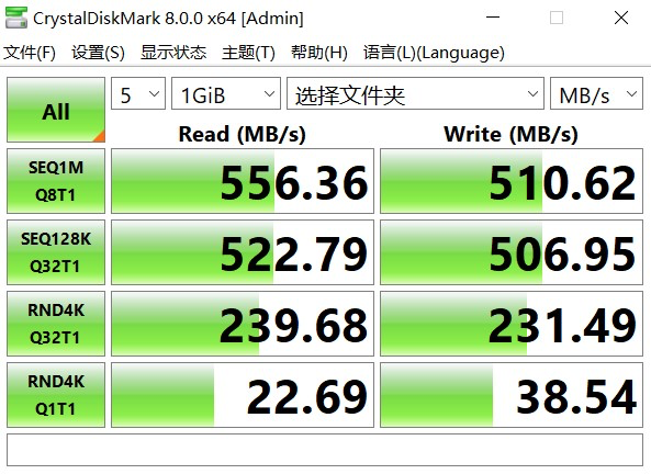 将致钛木星10移动固态硬盘通过USB4数据线连接到联想小新Pro14,然后使用CrystalDiskMark来对传输速度进行测试,大文件连续读取速度为555.96MB/s,连续写入速度为513.83MB/s。