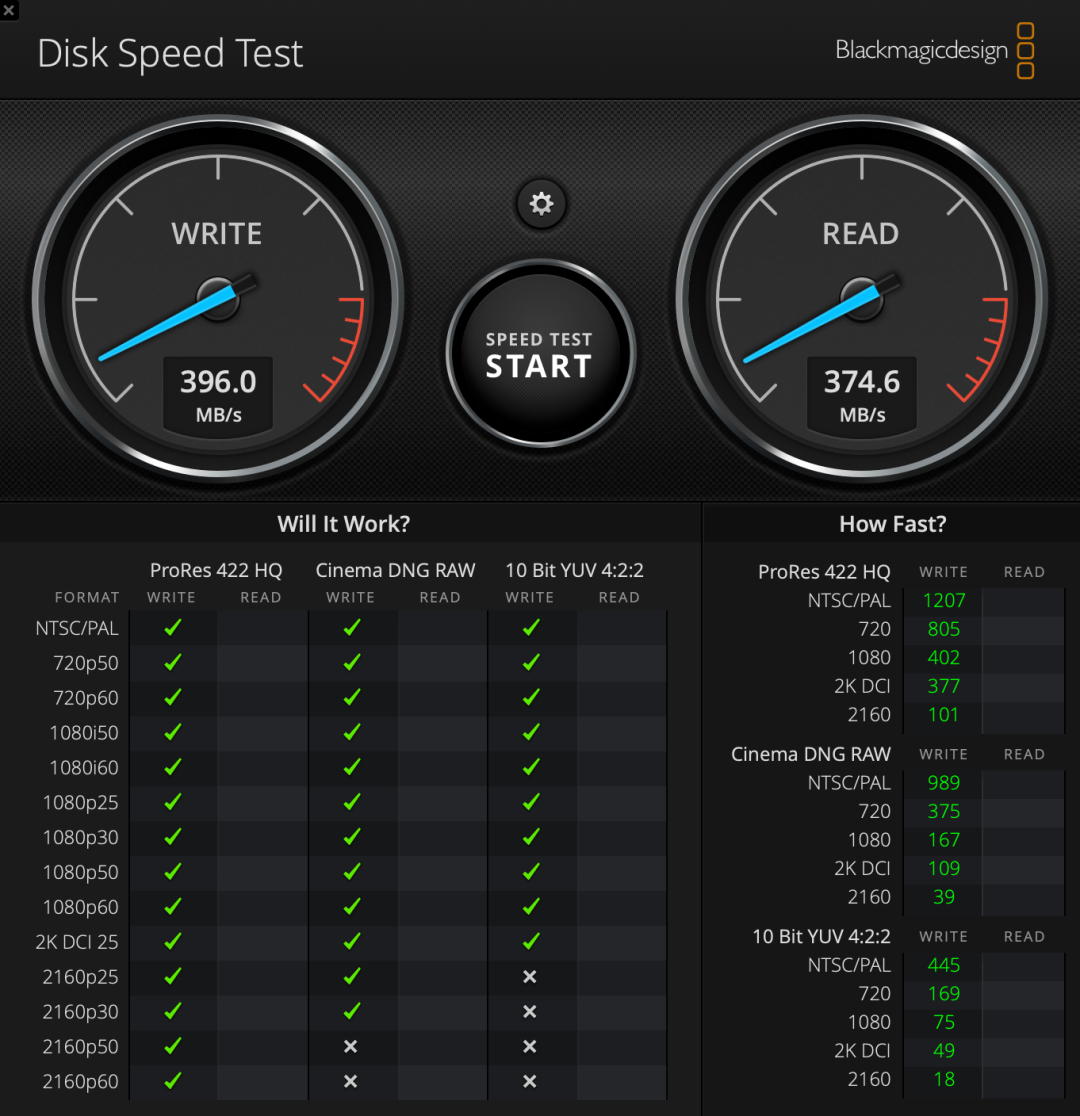 首先在Mac端使用Disk Speed Test对硬盘的传输测试进行测试,参与测试的线材为雷电3数据线,最终实测写入速度为396MB/s,读取速度为374.6MB/s。