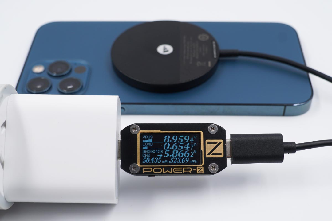 使用苹果30W充电器搭配mophie MagSafe磁吸无线充电器为iPhone 12充电,采集到输入端功率为8.99W。