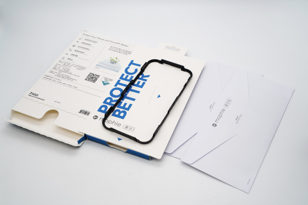mophie在产品的包装盒上也进行了精心设计,整个包装盒采用了折页的设计风格。翻开折页,两侧描述了mophie的这款钢化膜拥有除菌、防蓝光以及护眼的功能。而这些功能在目前看来也是非常有必要的,毕竟现在人们沉浸手机上的时间都比较长。